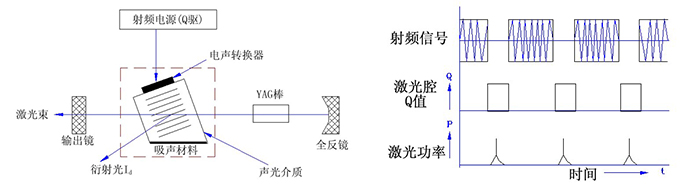 声光Q开关是利用声光相互作用以控制光腔损耗的Q开关技术。声光调Q是通过电声转换形成超声波使调制介质折射率发生周期性变化, 对入射光起衍射作用, 使之发生衍射损耗,Q 值下降, 激光振荡不能形成。在光泵激励下其上能级反转粒子数不断积累并达到饱和值, 这时突然撤除超声场, 衍射效应立即消失, 腔内Q 值猛增, 激光振荡迅速恢复, 其能量以巨脉冲形式输出。这是一种广泛使用的Q开关方式,其主要优点是重复频率高,性能稳定可靠。