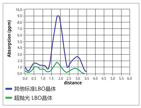 在波长为 1064/532nm 的增透膜的 LBO 晶体上进行波长为 532nm 的表面吸收:图表清楚地表明,在 532nm 波长下,镀膜 LBO 超级抛光晶体(粗糙度<3 ?)的表面吸收率比标准抛光镀膜 LBO 晶体(粗糙度约 10 ?)低约 4 倍。基于这一差异,我们制造的 LBO 超抛光晶体应具有更长的使用寿命。